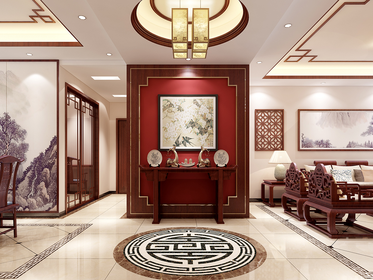 本案為中式古典,材質與顏色的選用以和諧為原則、無累贅冗余造型,溫馨的手法,保留中式風格所需要的必要的元素,在使用面積比例上推陳出新,結合配飾上力求指引居室的主人以輕松、愉快的狀態流連于居室營造的氣氛中??筒蛷d十分淡雅,這里沒有多余的色彩、布置和家具,沒有喧囂與繁冗,一派寧靜悠遠;設計將原本不規則且略顯零亂的天花加以簡化整合;設計采用傳統的入戶玄關門廳把客廳與餐廳兩個空間加以適當區分,形成一個隔而不斷,分而不離的互動空間,愜意的、時尚的、成功人士的品質生活體驗盡在其中。