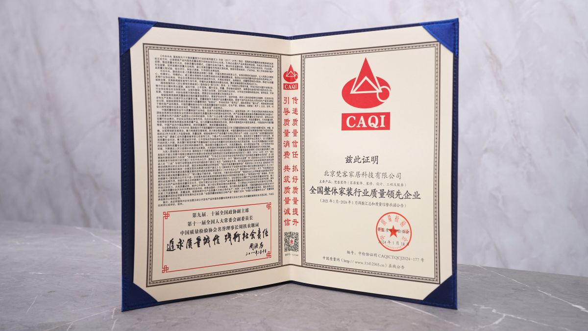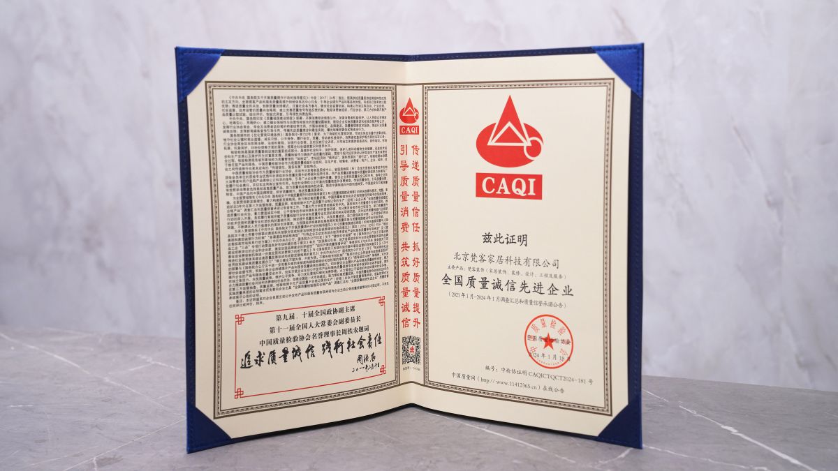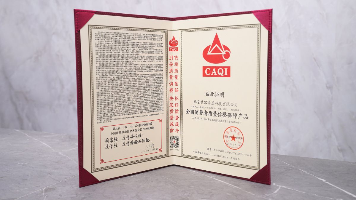 2024年初,梵客家裝收到中國質量檢驗協會頒發的三大證書:【全國質量誠信先進企業】、【全國整體家裝行業質量領先企業】、【全國消費者質量信譽保障產品】。中國質量檢驗協會是全國質量檢驗專業組織,梵客家裝曾積極參與該協會組織的服務質量誠信承諾等多項活動,為提高產品質量、服務質量、工程質量而持續發力,再次印證梵客家裝在整裝市場的領軍地位。