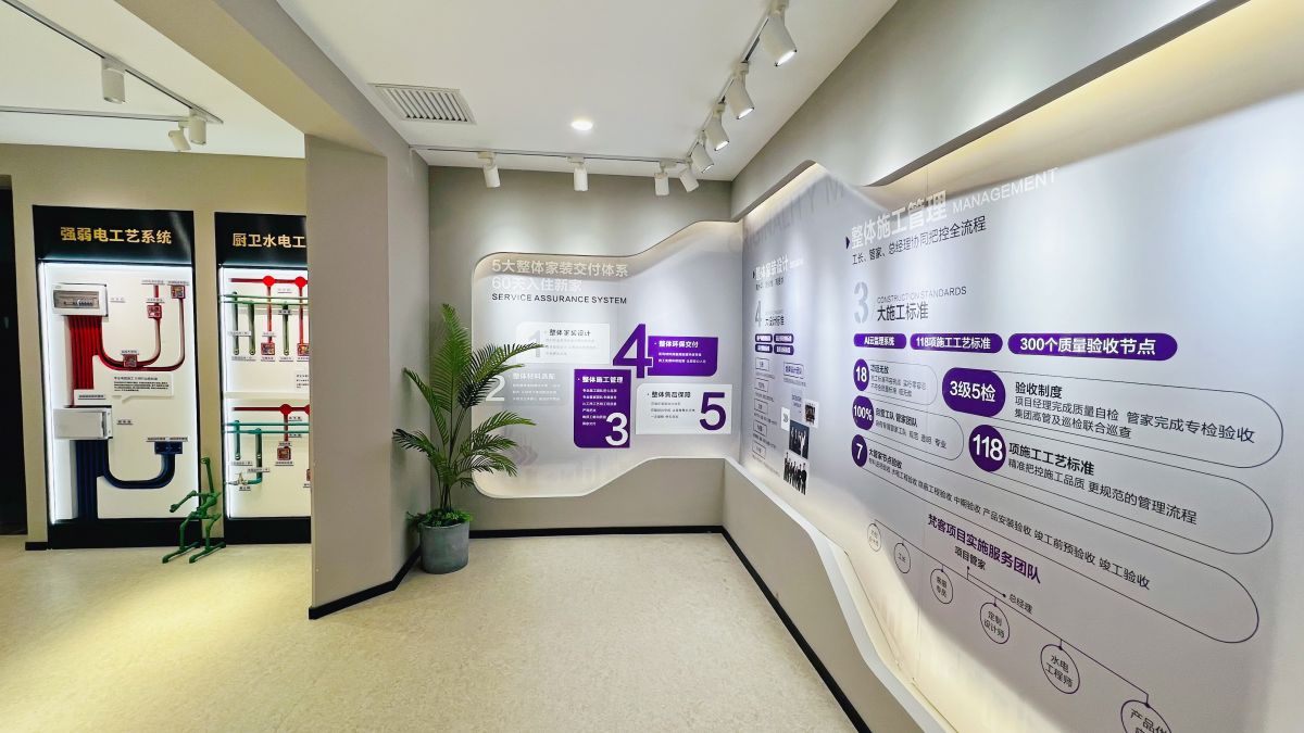 了解一個公司,從品牌開始。梵客家裝的品牌區就設置在1F,方便業主進門即可看到。品牌體系墻還清晰標明3大施工標準,4大設計標準,5大整體家裝交付體系,60天標準工期等內容,幫助業主更完善的了解施工流程。