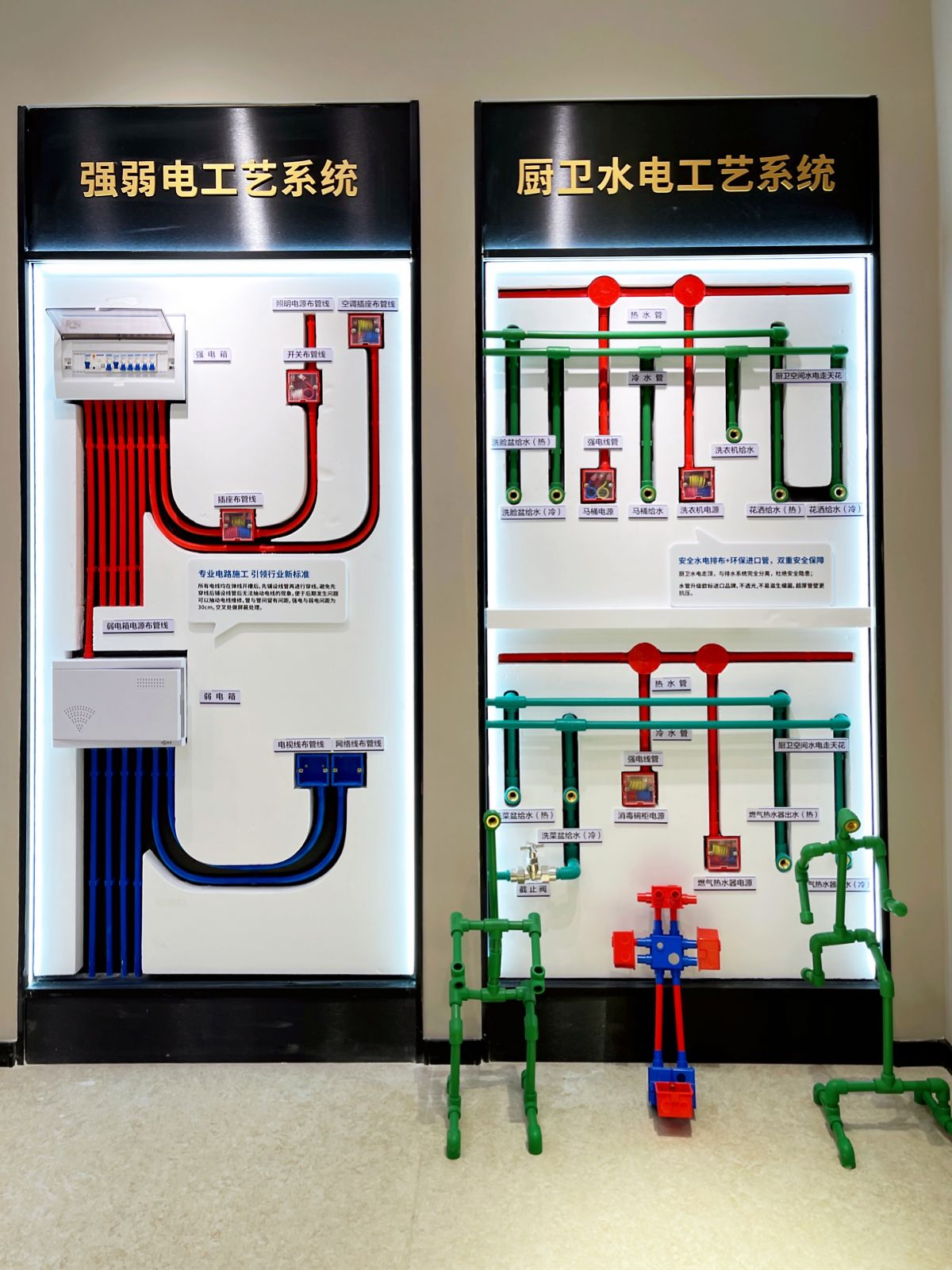 裝修工藝復雜,大家對工藝也沒有太多了解。1F專門設置了工藝區,展示并介紹了裝修中最常見到的幾種工藝,如墻面涂飾工藝、新砌隔墻工藝、薄貼工藝、雙層板吊頂工藝,以及強弱電工藝、廚衛水電工藝等,方便業主學習、理解,裝修更安心。