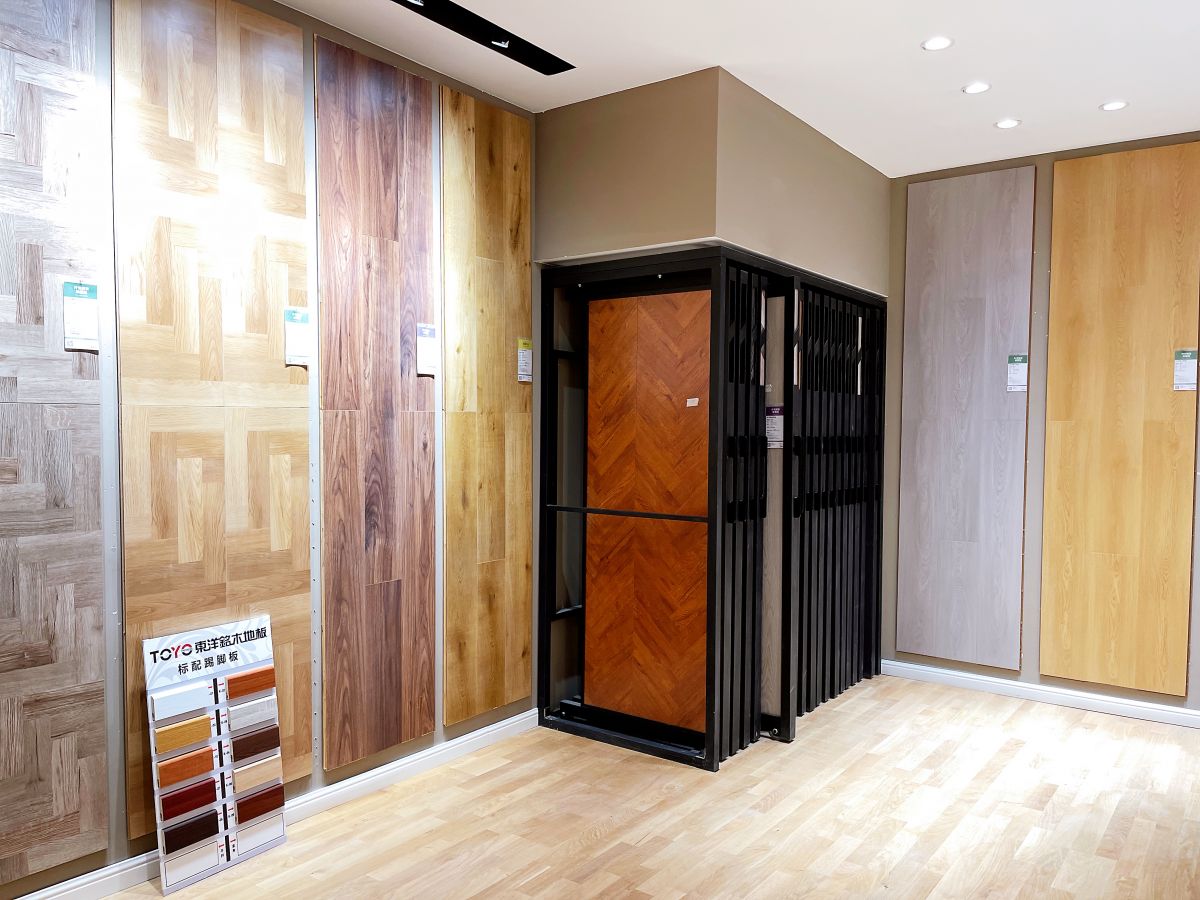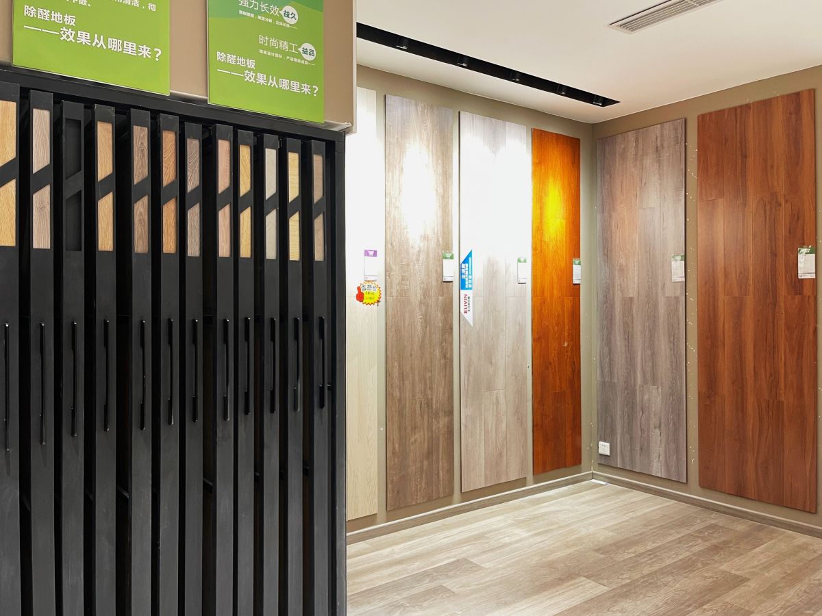 地板區,展區的地板品質高,突破傳統木材觸感,還原真實實木紋理及質感,表面柔韌性好,踩上去腳感舒適。尺寸全面,還有適合別墅豪宅的大板,百種花色滿足不同生活品位及個性需求。