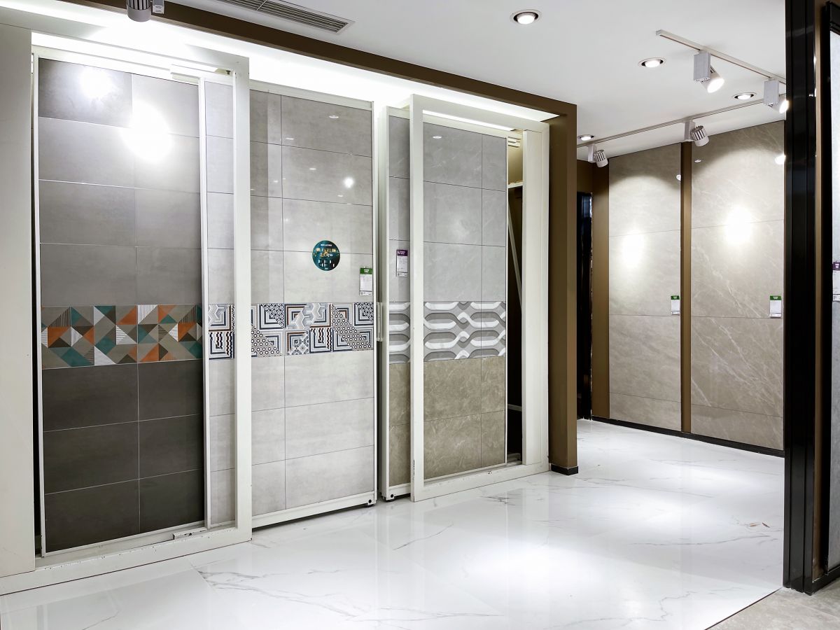 瓷磚區,品類多,百款紋理、全套色系,還有適合大空間的大尺寸瓷磚,方便業主隨心暢選。