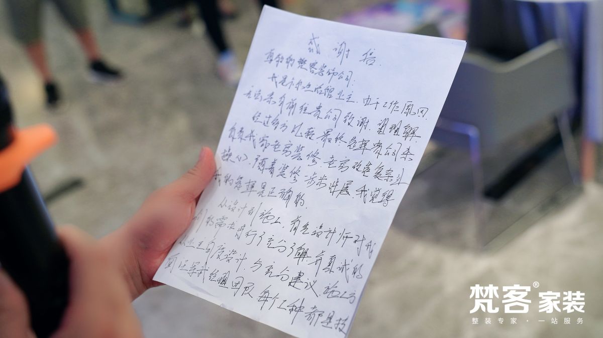 裝修完的業(yè)主朋友專程來梵客送上錦旗,手寫感謝信,一筆一劃都是誠懇。贊揚梵客服務(wù)好、工藝精湛、技術(shù)過硬,對新家非常滿意,對設(shè)計師、工長等也表示感謝。