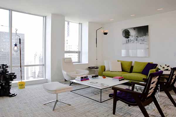 整個大廳看上去十分的大氣、簡約,特別是墻壁上的金色款型飾物,十分顯眼。半弧形的灰色沙發搭上紫色抱枕,顯得更加生動與優雅。它比往日中規中矩的L型沙發顯得更加有個性,給居室多添了一些的層次感。同時加上整片的地毯,再運用枯枝的樣式,細微的條紋,點亮了整體房間。