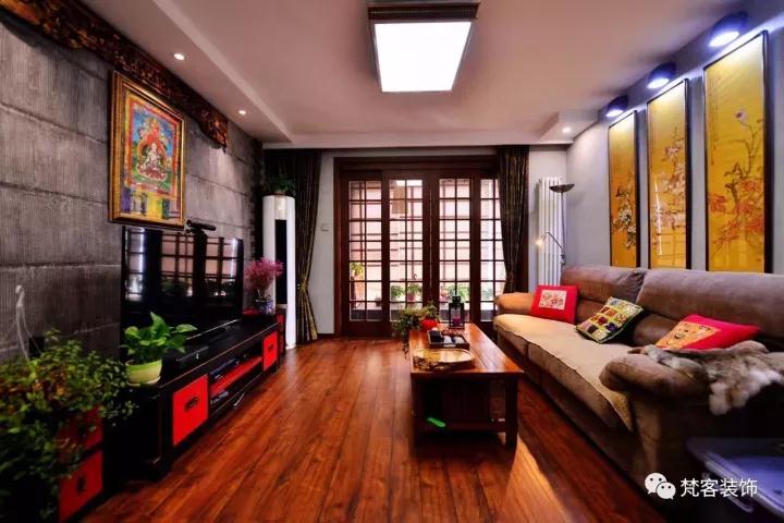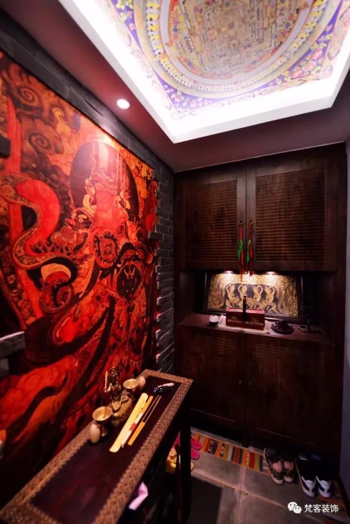 ? 電視背景墻上的唐卡是客戶多年前去西藏朋友贈送的,裝飾木質雕花是有些年頭的老舊物件,在高碑店古典家具一條街淘來的。