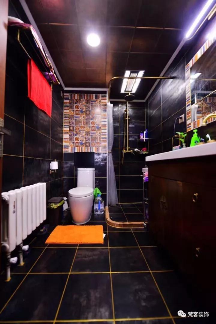 和廚房的復古相比,洗手間的風格相對現代。大膽運用金屬感的墻地磚,搭配銅色衛浴五金,使這個空間充滿不羈的韻律。馬桶后方用花片做背景墻、鏡面邊框以花片裝飾,這和整個空間藏文化理念相吻合。