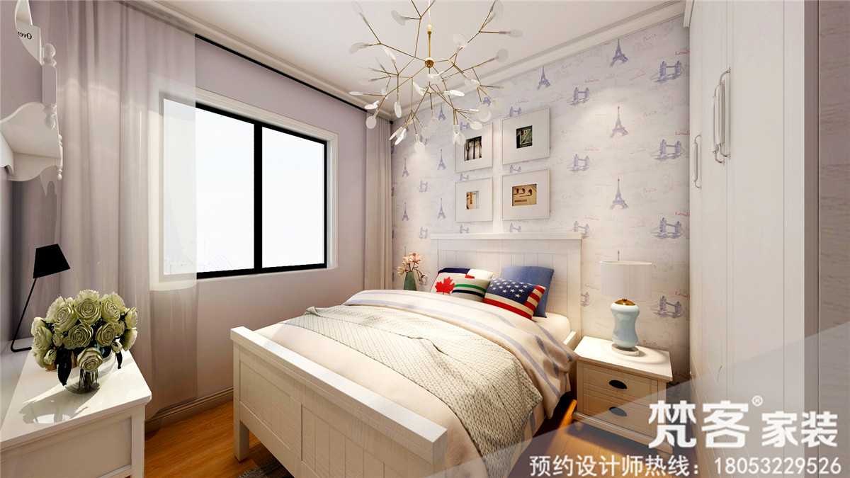 次臥 全房采用墻紙,花式墻紙搭配紋理墻紙,地板采用原木色系。配合白色家具,白色的小梳妝桌,既實用又不占空間,軟裝方面使用淡紫色,突出小女孩的活潑、可愛。燈具飾品等趣味裝飾活躍了兒童房。
