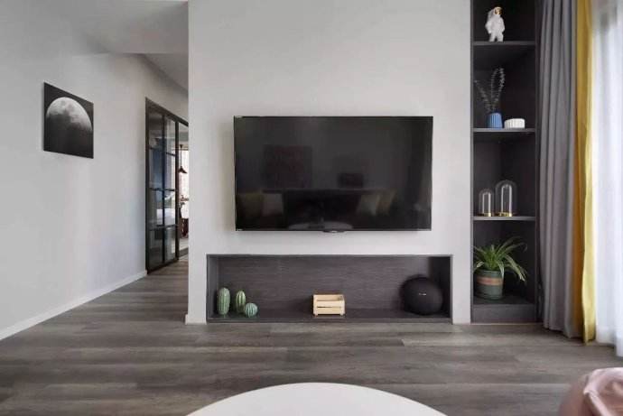 我為什么會糾結(jié)電視柜的問題呢,因為老婆大人已經(jīng)否定了我的投影,所以我也不會去弄音響以及其他設(shè)備了,就單單一個電視機?,F(xiàn)在的電視機都自帶安卓系統(tǒng),也不需要機頂盒,那我弄個電視柜的話還能放什么?如果不需要的話,我只要像題圖這樣,直接掛個電視機就完事兒了。
