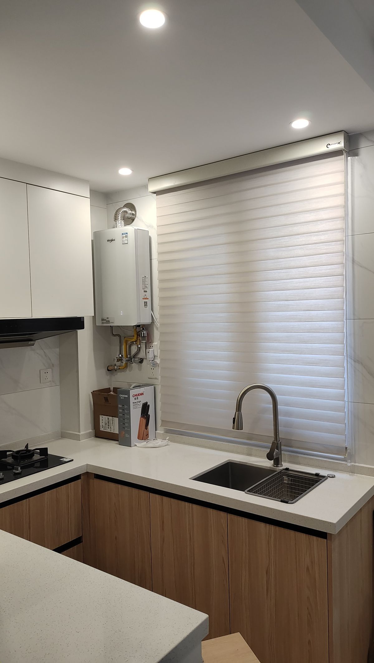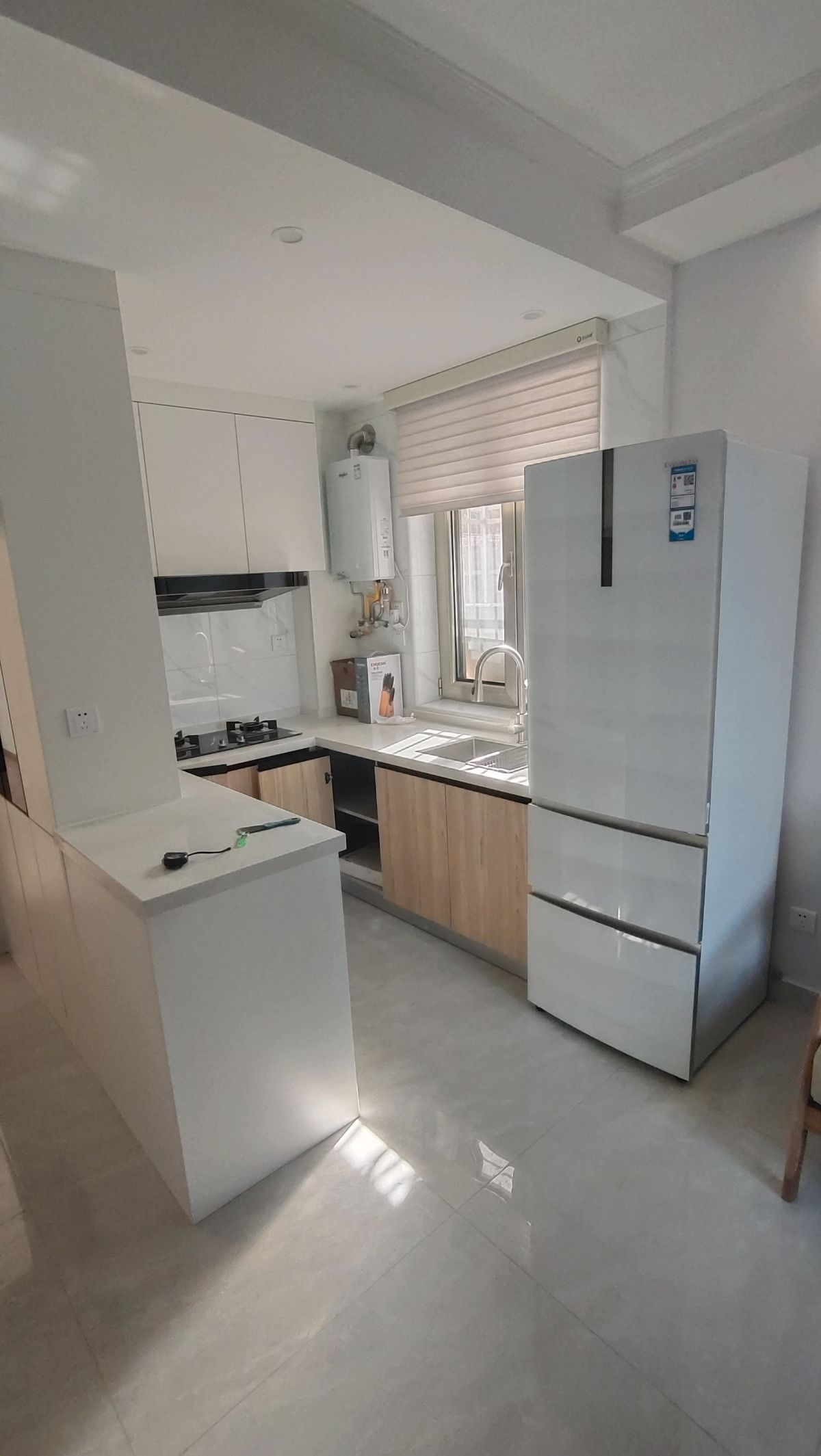 ↑↓原燃氣管道沒法動,設計了對門酒柜將其隱藏。上下兩張圖可以看到安裝柜子前后對比。