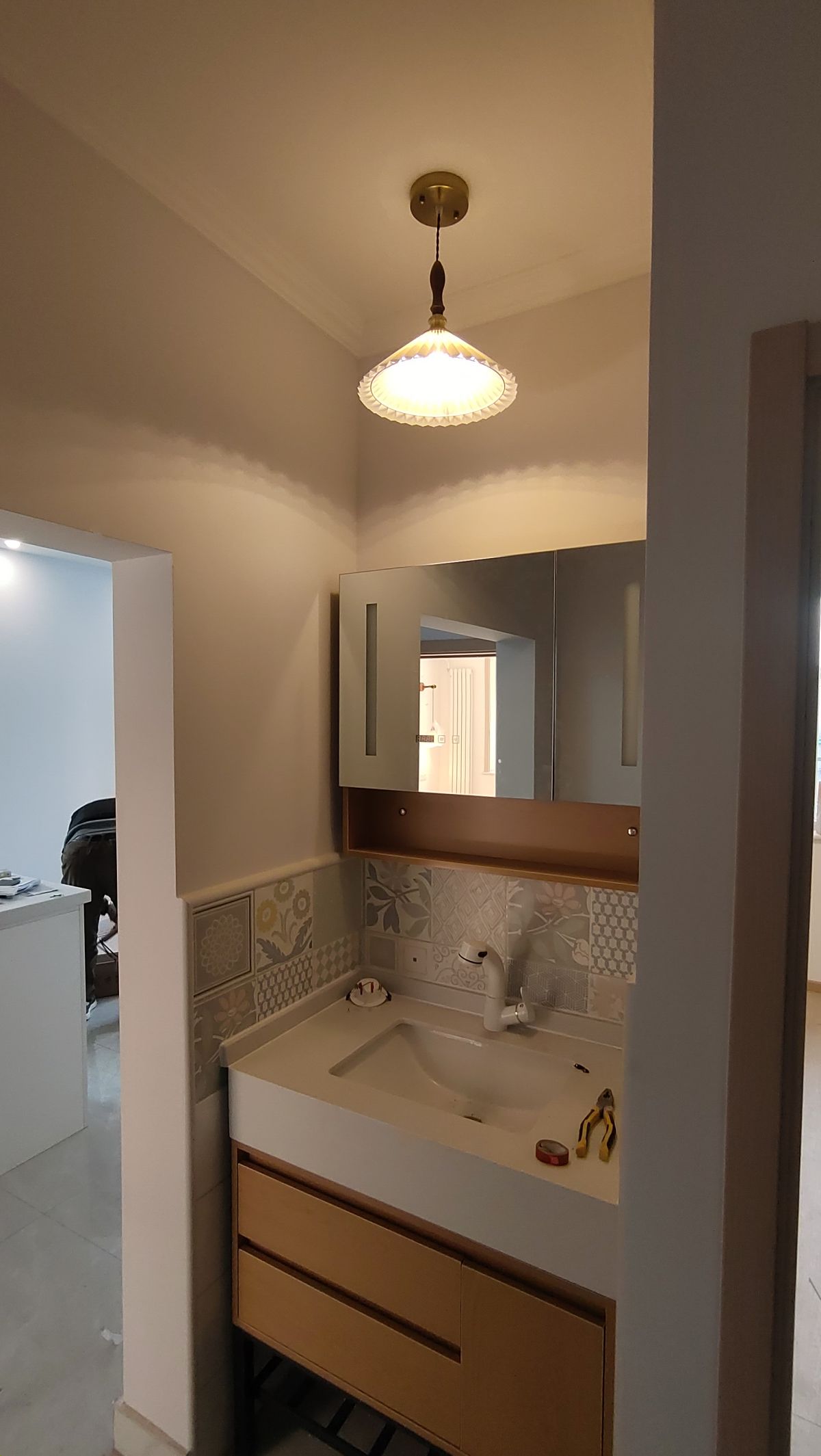 衛生間,面積較小,很難實現業主希望的干濕分區,于是將墻體外移,擴寬內部空間,并將側排改為壁掛馬桶,解決了原有的臺高問題。