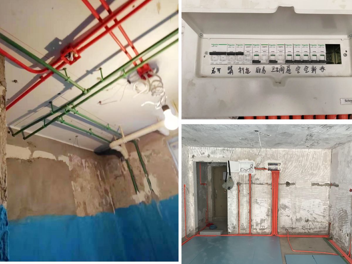 水電施工階段,走線要遵循橫平豎直的規范,排列整齊,紅色強電,藍色弱電。交叉處用錫箔紙纏繞隔開,避免干擾。確保電上水下,嚴禁水電同槽。線頭必須包頭打卷。